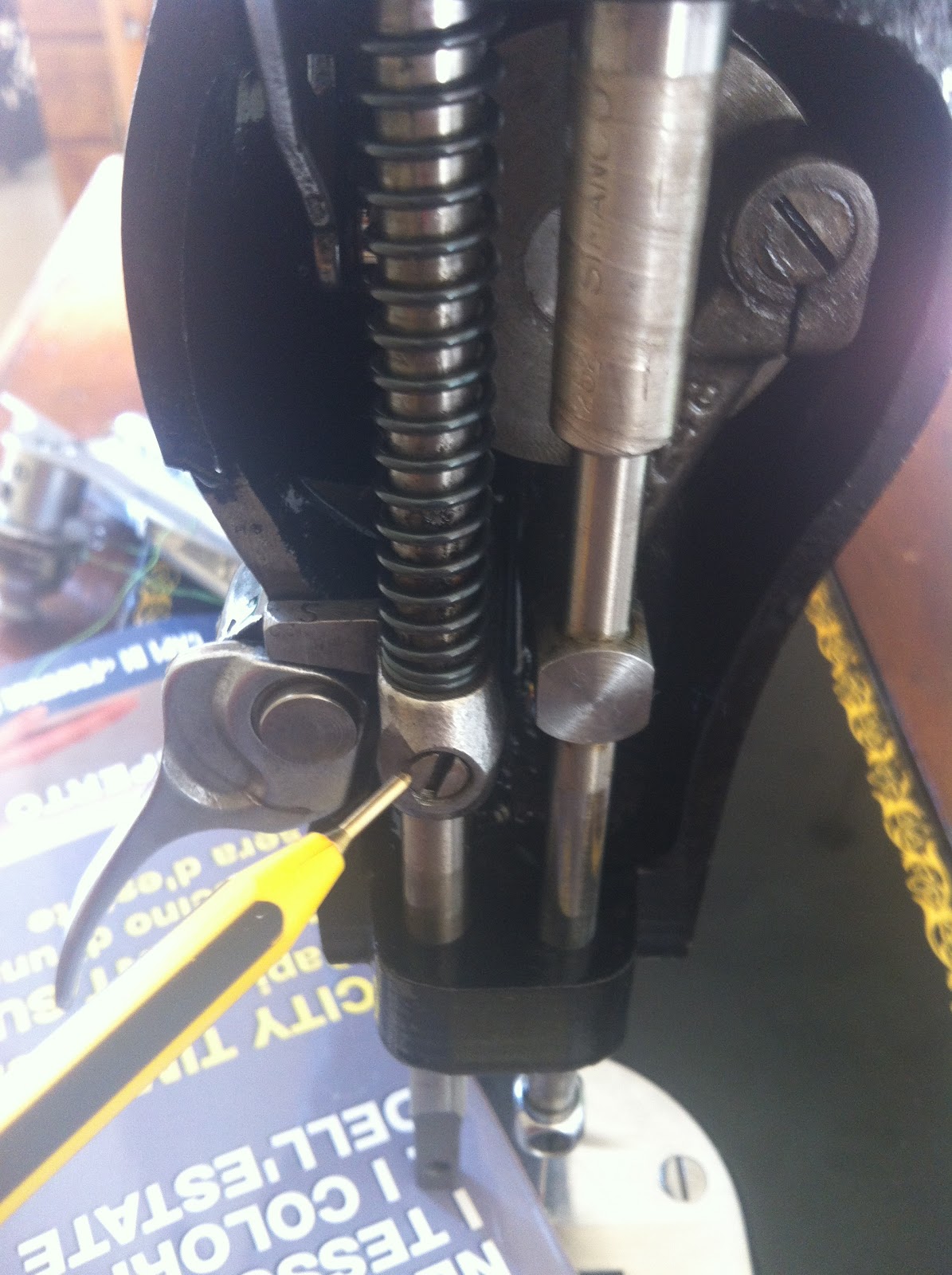 1- Una volta smontato il blocco tensione , potete regolare come più vi piace l'altezza della molla della tensione del filo . Per farlo dovete allentare la vite che si trova a lato del blocco.